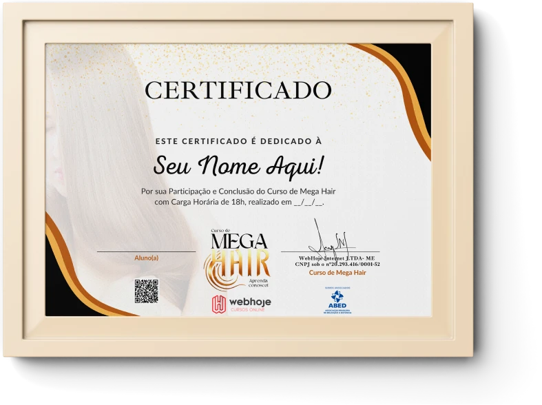 Ao finalizar o curso de Mega Hair, você irá baixar um lindo certificado de conclusão válido em todo o território nacional. Este certificado não só comprova a sua dedicação e empenho, mas também valoriza o conhecimento adquirido, proporcionando uma prova concreta de sua qualificação.